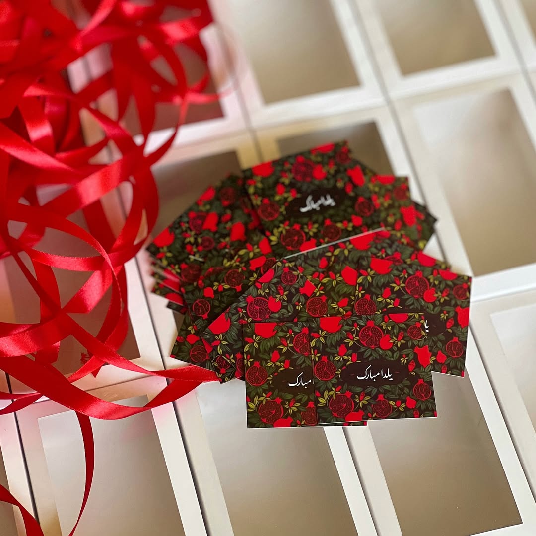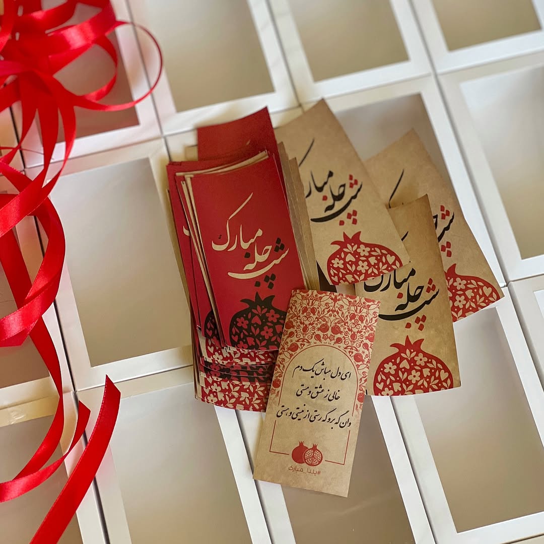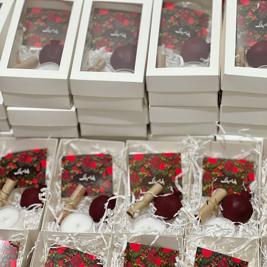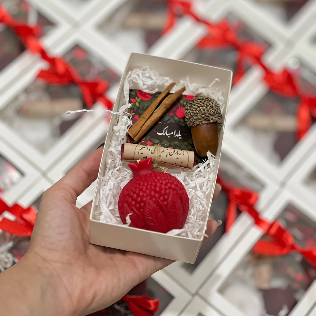 شمع انار ۶ سانتى مترى + بلوط طبيعى + فال حافظ + دارچين طبيعى + كارت پستال يلدا مبارك + بسته بندى هديه اى